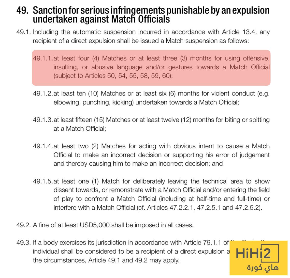 وأضاف أن العلي اكتفى بمنحه البطاقة الصفراء الثانية بدلا من الحمراء المباشرة «شفقة عليه»، رغم أن سبب الطرد هو استخدام إشارات مسيئة تجاه الحكم، وهو ما تنص عليه المادة 49.1.1 من لائحة الانضباط الآسيوية.